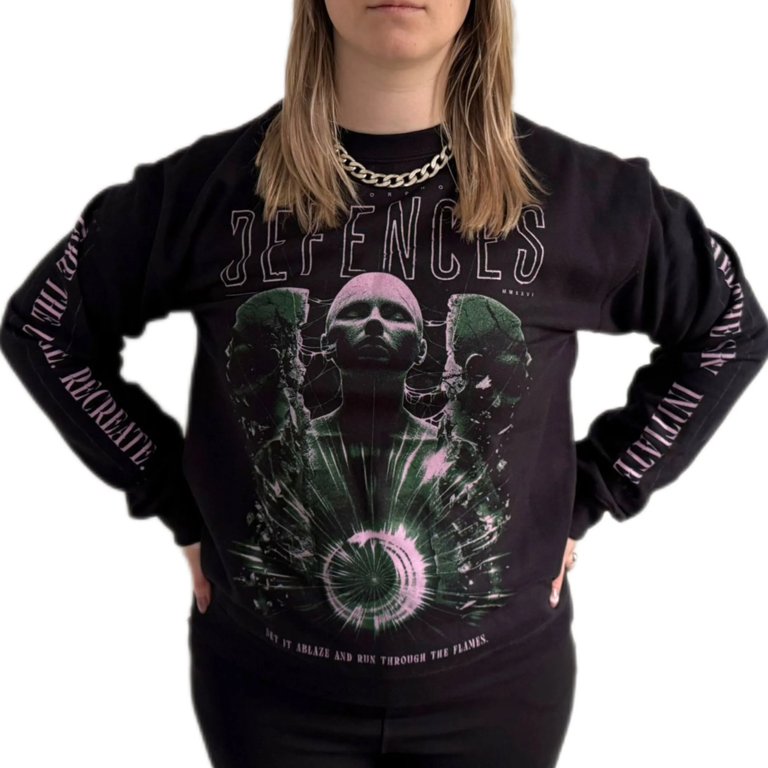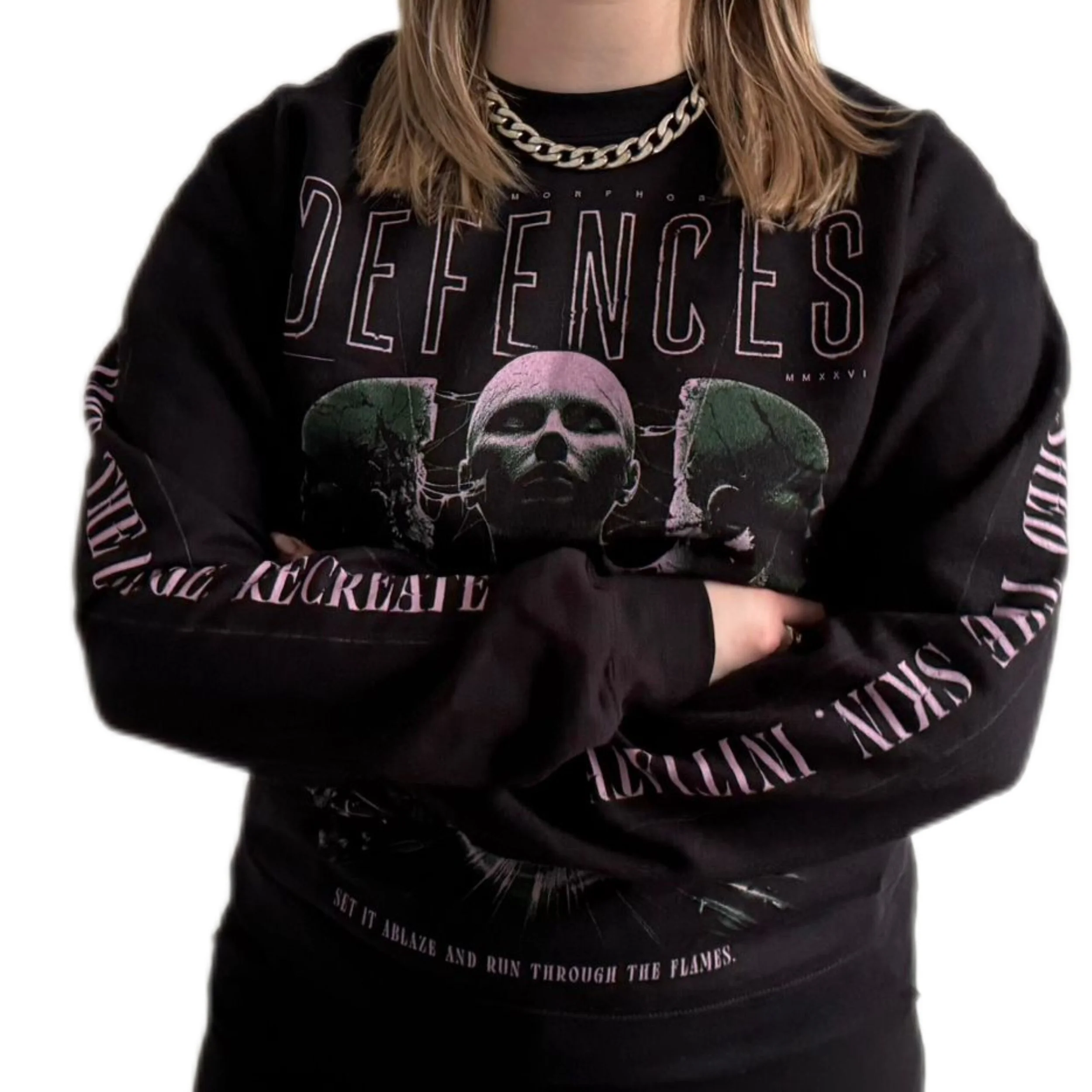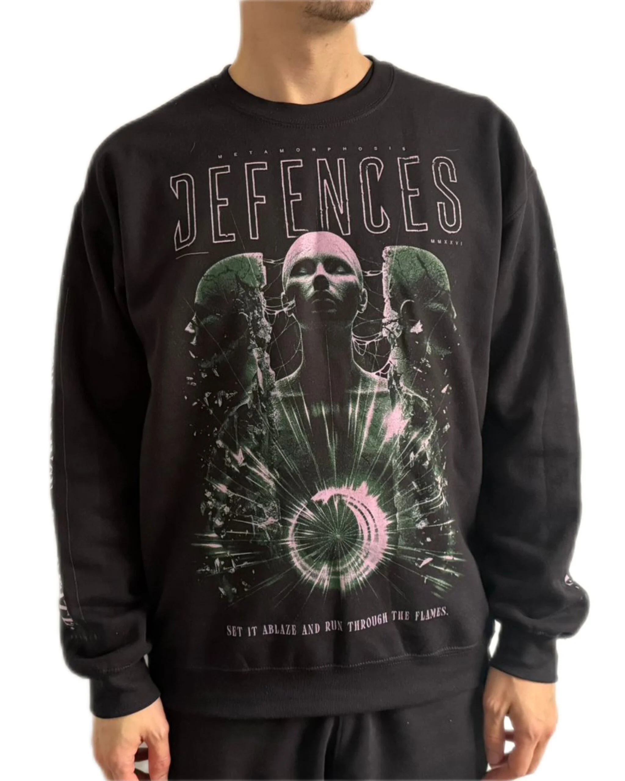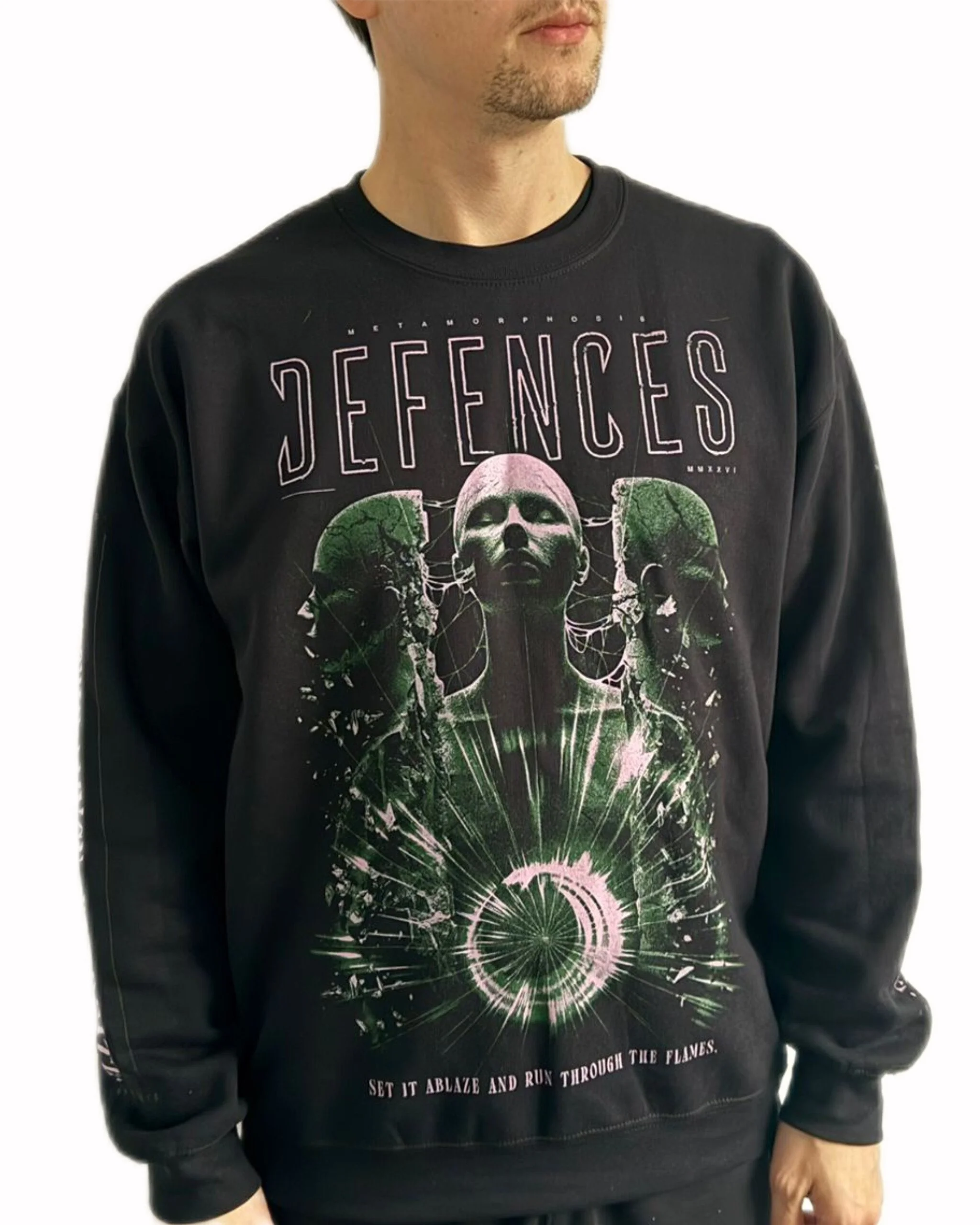 To celebrate our latest single Metamorphosis, we’ve bought the lyrics to life by working with Simon Atkinson, famed for his merch designs for Architects, Bleed From Within, Heart of A Coward, and more. His impressive visual interpretation of the lyrics is printed on a premium pullover that is verrrrry soft. You will love it.